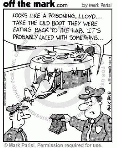 Poisoned Goats Crime Scene Two goats dead at dining table, police officer says it's probably poisoning, tells Lloyd to take boot they were eating back to lab for testing.