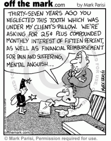 Attorney tells Tooth Fairy 37 years ago, he neglected client's tooth, they ask for 25 cents plus compounded monthly interest and pain, suffering, mental anguish.