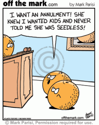 Oranges Divorce Court Husband orange tells judge he wants divorce because he wanted kids and wife never told him she was seedless.