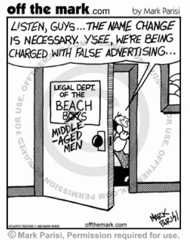 Legal department for The Beach Boys says the name has to be changed to The Beach Middle-Aged Men because "boys" is false advertising.