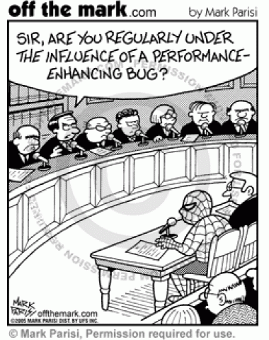 Spider Man on Trial Spider Man is on trial for using a performance enhancing bug.