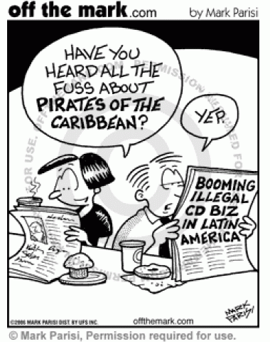 A couple talk about two different Pirates of the Caribbean; one the movie, the other an illegal CD.