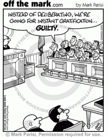 Jury goes for instant gratification instead of deliberating, and declares the defendant guilty.