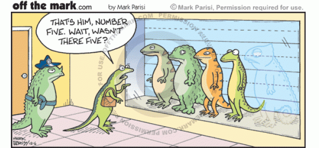 Chameleon Line Up Chameleon in police lineup camouflages himself to avoid being identified.
