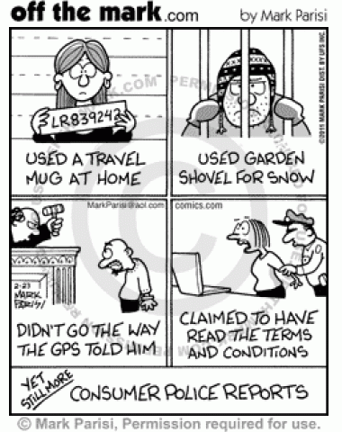 Consumer Police Reports Consumer police reports of abusing travel mugs, garden shovels, gps, and terms and conditions.