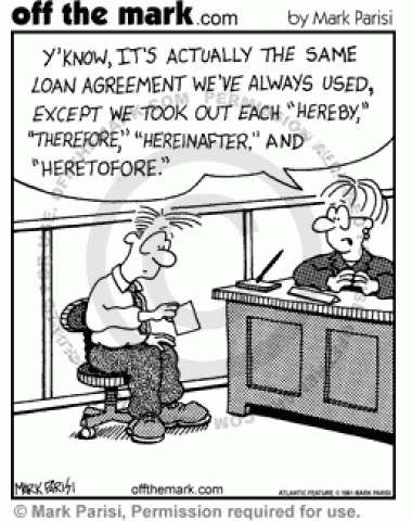 Man in office holds tiny piece of paper, loan officer says it's same loan agreement as before, just removed each "hereby, therefore, hereinafter, and heretofore."