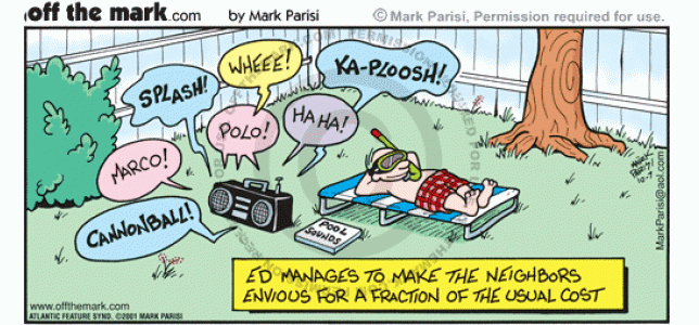 Pool Jealous Neighbors A man plays a tape of pool sounds to make his neighbors think he has a pool.