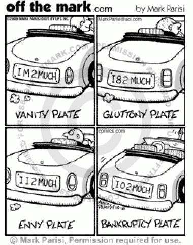 Vanity, gluttony, envy, and bankruptcy car license plates.
