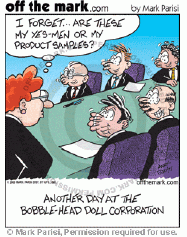 Bobble Head Yes Men 'Yes-men' act as bobble-head dolls.