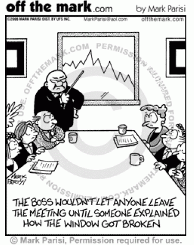 Boss's Meeting Boss holds employees in office meeting over a broken window cracked to look like a line graph.