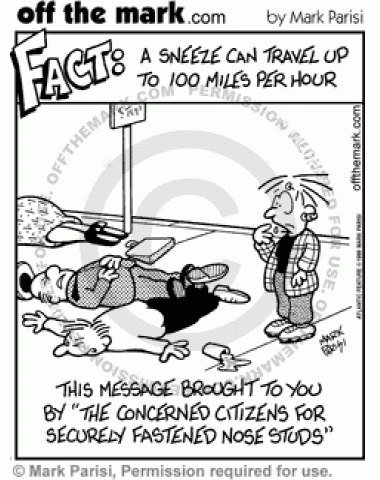 Sneezes can travel up to 100 miles per hour, so people should secure their nose studs.