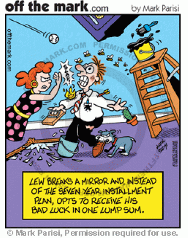 Mirror Luck Lump Sum A man breaks a mirror and opts to receive all his bad luck in one lump sum.