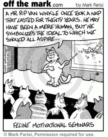 Feline Motivational Seminars A cat gives a motivational speech using Rip Van Winkle's 20-year-nap as an example.