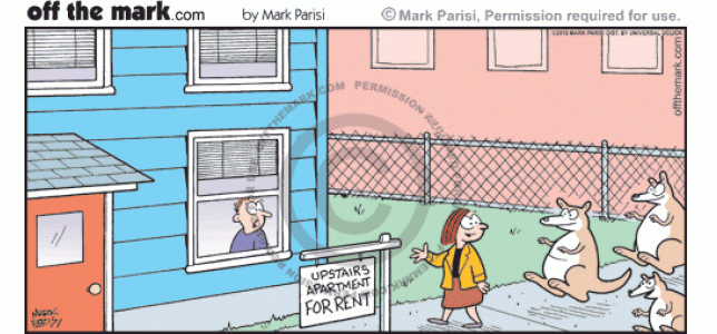 Kangaroo's Upstairs Neighbors A man is alarmed to see that kangaroos might become his upstairs neighbors.