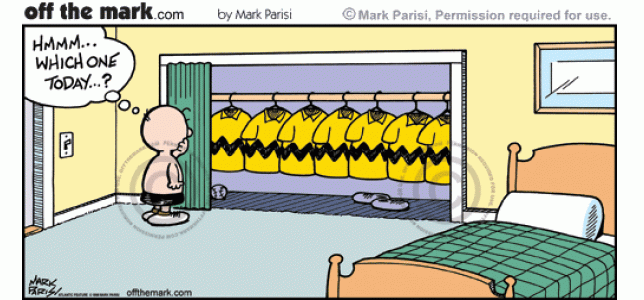 Charlie Brown has to choose which shirt to wear in the morning.