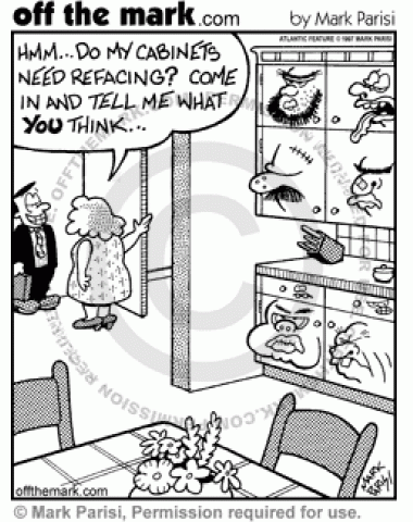 A woman's cabinets might need refacing because they have ugly faces on them.