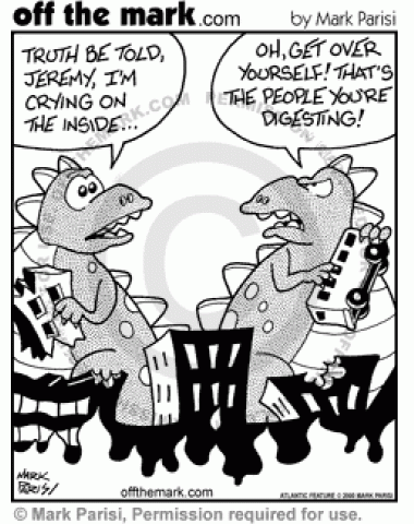 Godzilla says he's crying inside, but his friend says it's just the people he's digesting.