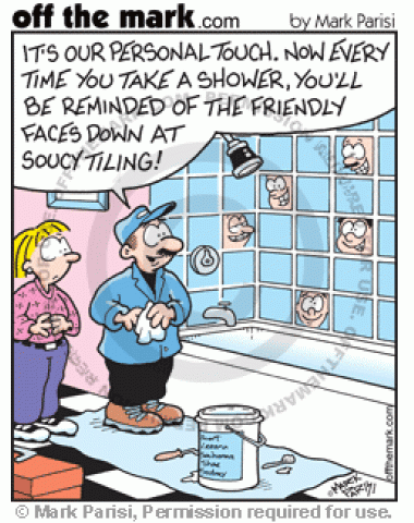 Personal Bathroom Tiling Bathroom tiles have people's faces on them, giving a personal touch
