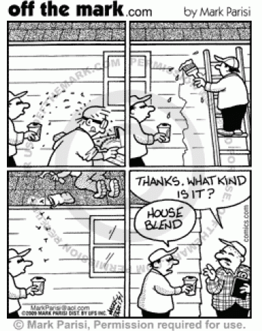 House Blend Painter's Coffee Sawdust, paint, and nails spill turn coffee into house blend for construction boss.