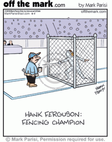 Hank Ferguson the builder constructs a fence around fencing opponent.