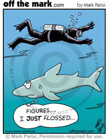 Shark Dental Hygiene Scuba diver swims above shark, and shark doesn't eat him because he just flossed his teeth.