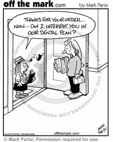 A Girl Scout sells a woman a bunch of cookies, then asks if she's interested in the Girl Scout dental plan.