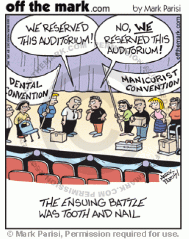 Dentists and Manicurists both want to have a convention at the same auditorium.
