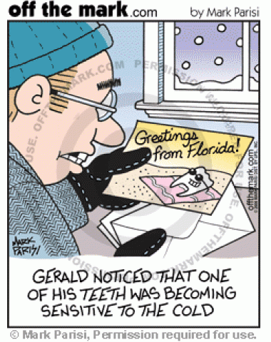 Sensitive Tooth's Florida Vacation One of Gerald's cold-sensitive teeth goes to Florida to warm up and sends a postcard.