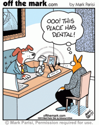Dog Bone Dental A dog offers another dog a bone to show him that his job has dental benefits.