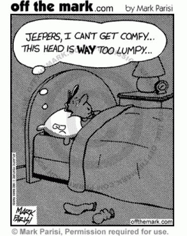 Insomniac Pillow Pillow complains that he can't get any sleep because the person's head lying on top of him is too lumpy.