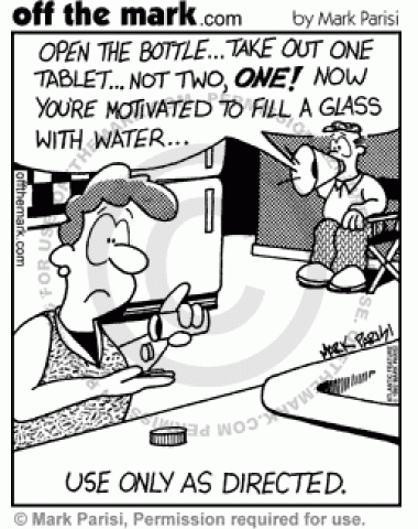 Woman taking medicine labeled "Take Only As Directed" is following director's orders to take out one pill, then fill glass with water.