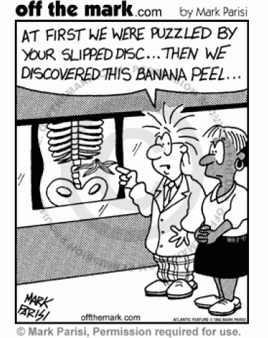 Banana Peel Injuries Doctor and patient look at x-ray while he explains how her slipped disc puzzled him until he saw a banana peel near her spine.