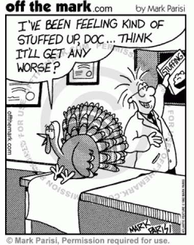 Thanksgiving Turkey's Sick Sick turkey visits the doctor feeling stuffed up and wondering if it's going to get worse, while the doctor grabs box of stuffing.