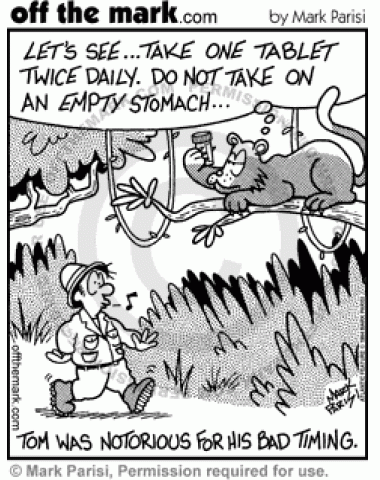 Explorer's Bad Timing An explorer walks under a wild cat just as the cat realizes he has to take his medication with food.