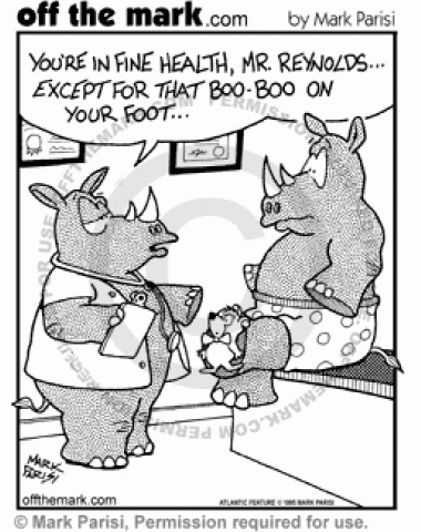 A rhino gets his physical and is in good health, except he has a boo boo bear on his foot.