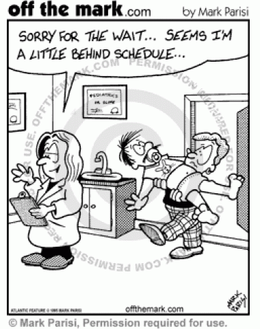 Slow Doctor A doctor makes a mom wait so long for an appointment that her son grows into an adult.