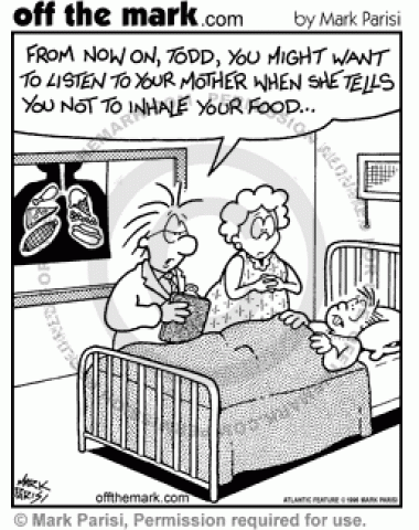 Inhaling Food A doctor tells a kid to listen when his mom says not to inhale his food, because his lungs are full of food.