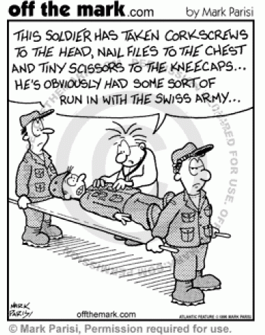A soldier's injuries are from a corkscrew, a nail file, and tiny scissors, showing he was attacked by the Swiss Army and their knife.