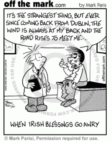 Bad Irish Blessings A man is windblown and beat up because the wind is always at his back and the road rises up to meet him.