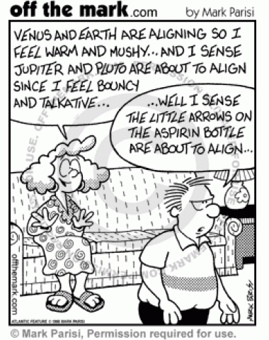 Astrology Aspirin A woman talks about planets aligning and a man responds by saying the arrows on the Aspirin bottle are going to align.