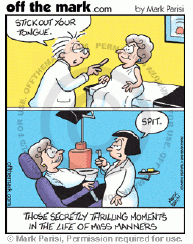 Miss Manners' Secrets Miss Manners is excited to get to stick her tongue out and spit at the doctor and the dentist.