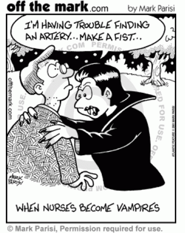 Vampire Nurse Artery A nurse becomes a vampire, but still has trouble finding an artery.