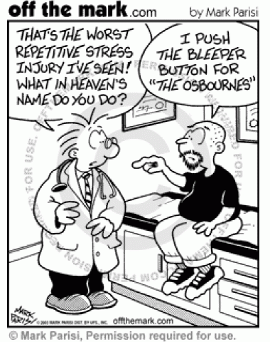 Osbournes Stress Injury Doctor The bleeping pushing man for 'The Osbournes' sees a doctor for a repetitive stress injury.