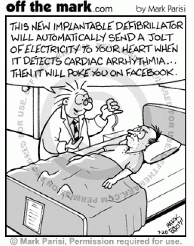 Poking Defibrillator Man gets implantable defibrillator that jolts heart and pokes you on Facebook.