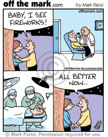 Firework Surgery A couple kisses and the man sees fireworks, so he gets eye surgery to make them go away.