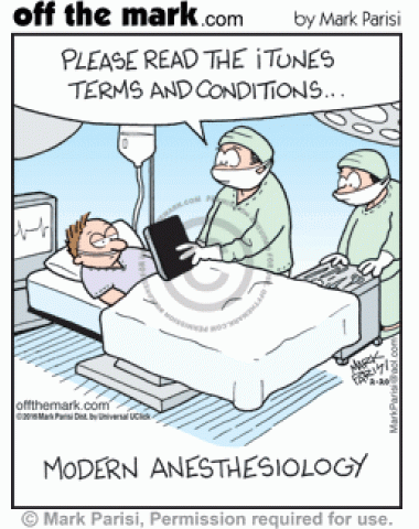 Modern Anesthesiology Instead of counting backwards, anesthesiologists have patients read itunes terms and conditions.