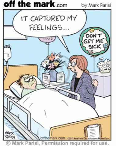 Don't Get Me Sick Balloon Woman brings man in hospital a balloon that says Don't Get Me Sick.