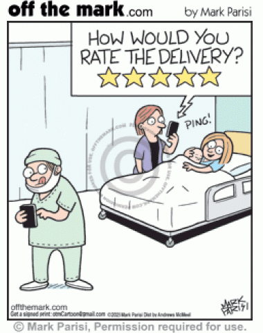 Intrusive Hospital Baby Delivery Doctor Review Message Ob-Gyn doctor on cellphone texts parents with newborn online 5 star rating request after birth.