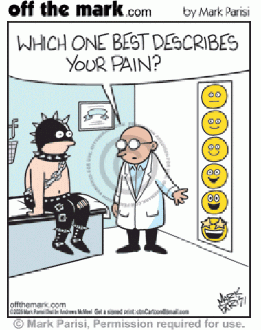 Doctor’s S & M Bondage Fetish Pain Scale Smilies Scale Physician asks spiked leather bondage sadomasochism patient to describe pain on smiley face chart.