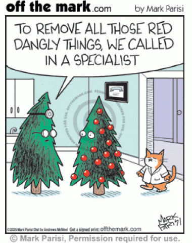 Doctor Cat Xmas Ornament Removal Specialist Tree physician tells Christmas tree patient that kitty is specialist at removing dangly red balls.